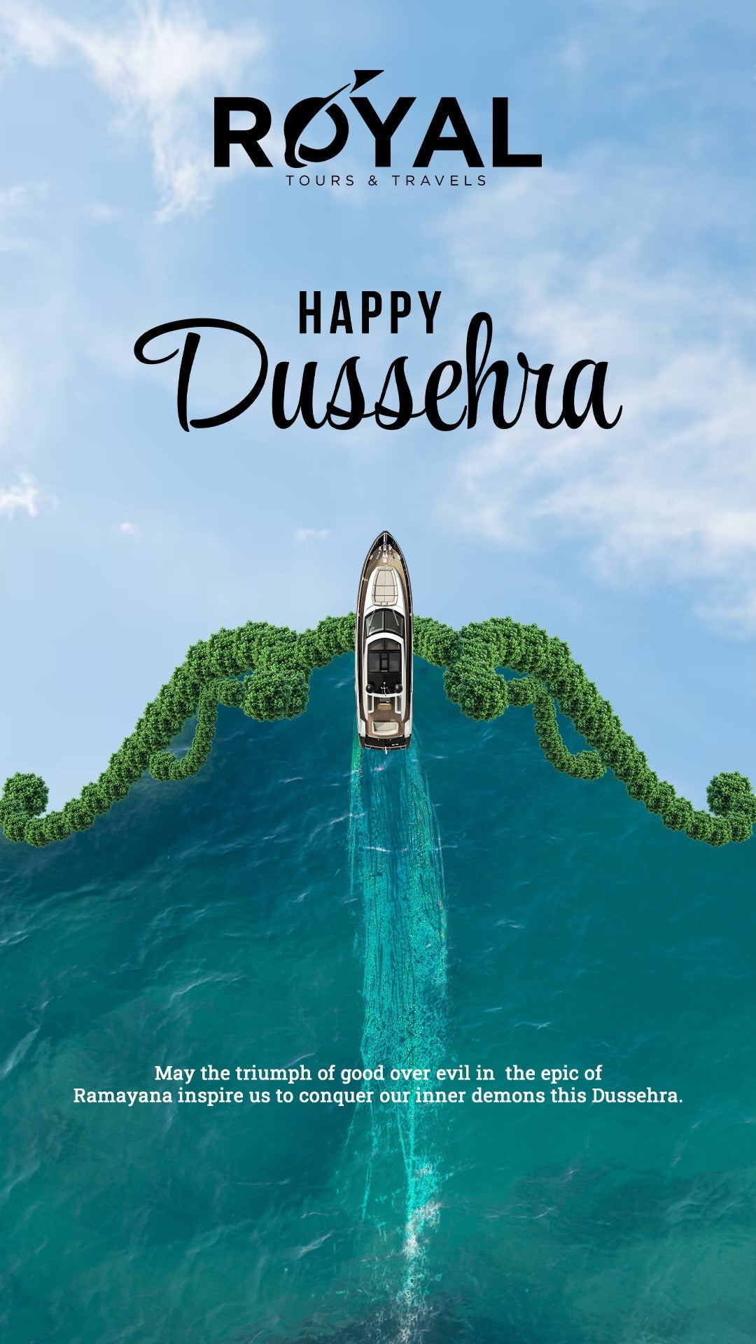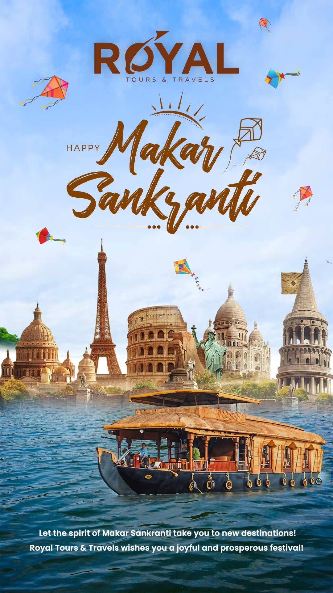 Copywriting: Festive greeting + destination highlight + CTA (Book Your Trip • DM for Deals • Call Now)