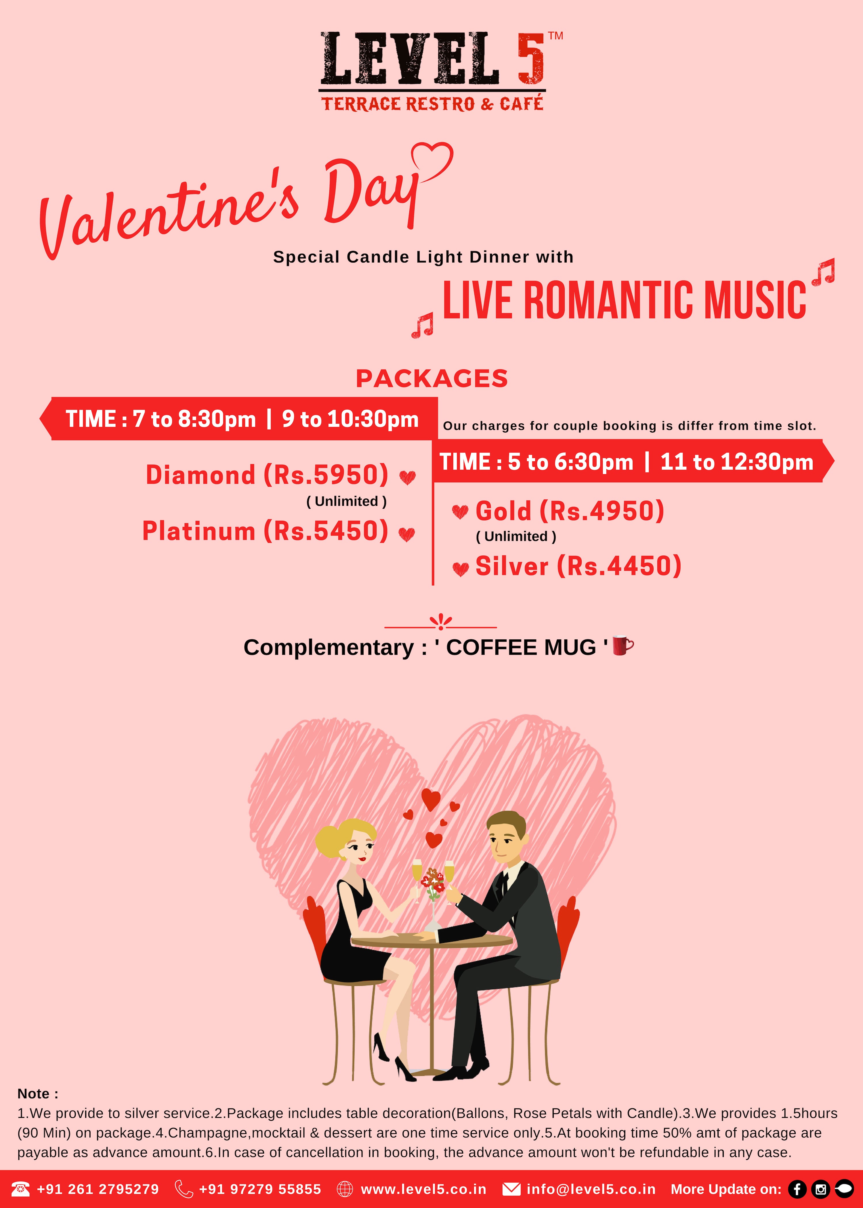 At Level 5 Terrace Restro & Café, we offer an unforgettable Valentine’s Day experience with a romantic candlelight dinner, live music, and a range of exclusive packages. Perfect for couples looking to celebrate in style, we provide a charming atmosphere and personalized service for the most memorable evening.