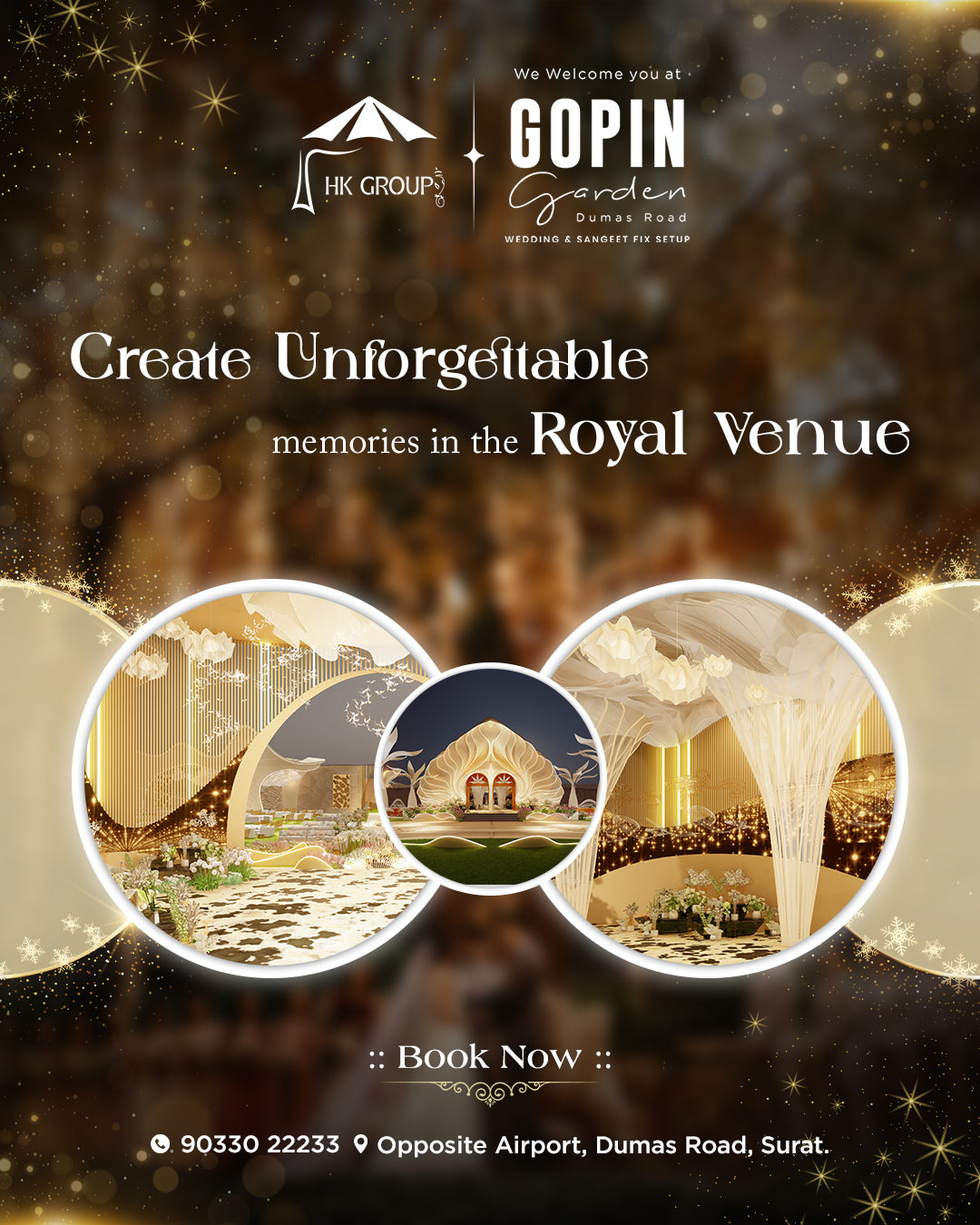 Transform your special event with our stunning custom-designed event posters! This promotional design highlights the incredible wedding setup options available at Gopin Garden by HK Group.