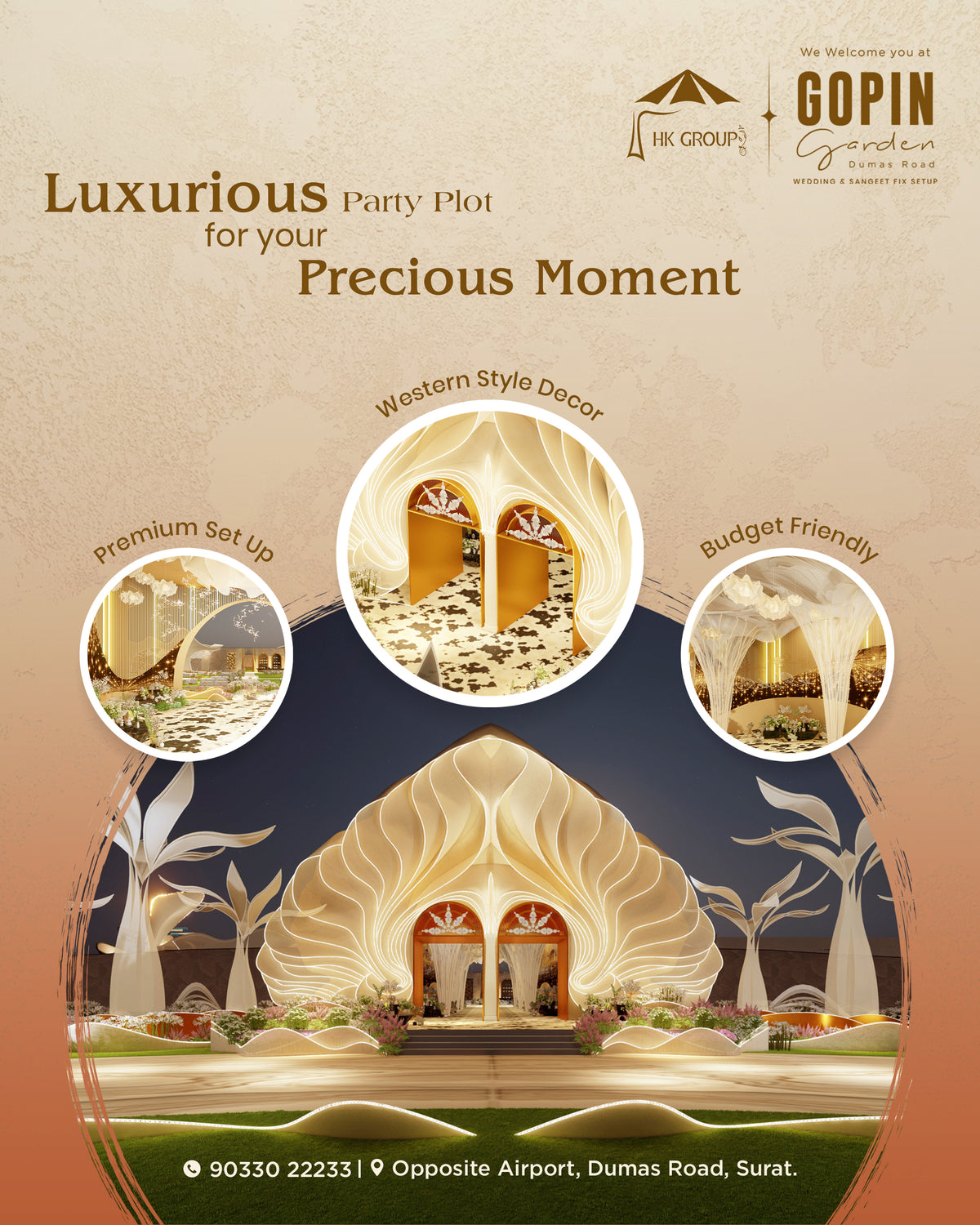 Transform your special event with our stunning custom-designed event posters! This promotional design highlights the incredible wedding setup options available at Gopin Garden by HK Group.
